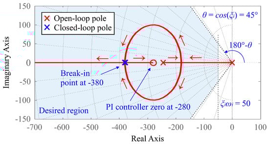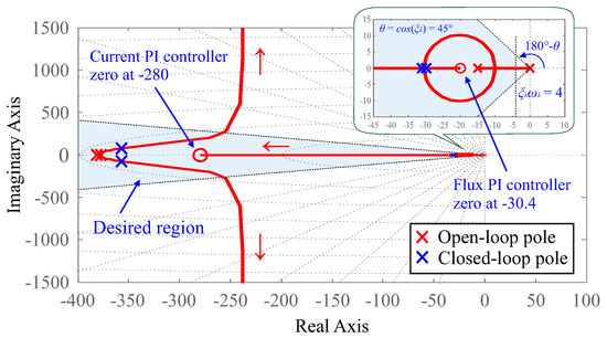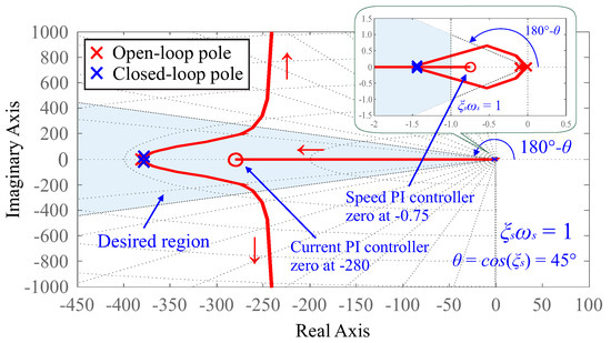 in which, assuming , the controller gain is calculated as . Figure 11 presents the resulting root locus for the speed control loop. According to Figure 11, all closed-loop poles are located within the desired region. In this case, the closed-loop system has two real and equal non-dominant poles that correspond to the closed-loop poles of the current inner loop and are located further from the imaginary axis. In addition, the closed-loop system also has two real and equal dominant poles that are allocated closer to the origin and correspond to the desired pole .