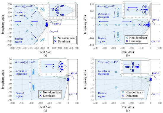 Figure 13c,d show the closed-loop pole behavior of the speed control during variations in and . According to Figure 13c, when is increasing, the non-dominant poles are closer to the real axis, while the dominant poles are place outside the desired region and closer to the imaginary axis, which can result in a more oscillatory transient response and a decrease in the system stability margin. On the other hand, according to Figure 13d, when is increasing, the location of the non-dominant poles has negligible change, while the dominant poles are closer to the real axis, which can result in a more dampened transient response. However, the dominant poles are allocated within the desired region, which demonstrates the low influence of parameter variation on the speed controller performance.