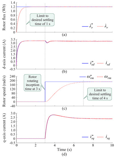 Dynamic responses from system’s controllers (a) rotor flux controller, (b) d-axis armature current controller, (c) rotor speed controller and (d) q-axis armature current controller.