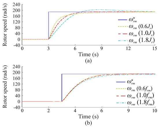 Figure 15 shows the speed controller dynamic response assuming variations in the and parameters around their nominal values listed in Table 1. According to Figure 15a, adopting a 40% lower value for , the rise time is reduced, while the settling time and percent overshoot do not change. On the other hand, adopting an 80% higher value for , the speed controller transient response presents a higher rise time, settling time and percent overshoot. Then, Figure 15b illustrates the speed controller dynamic performance considering similar variations in . In this case, the effect of the variation in was small, since the controller transient responses were almost identical. Therefore, the speed controller dynamic performance assuming variation in and is in accordance with the sensitivity analysis performed in the previous section.
