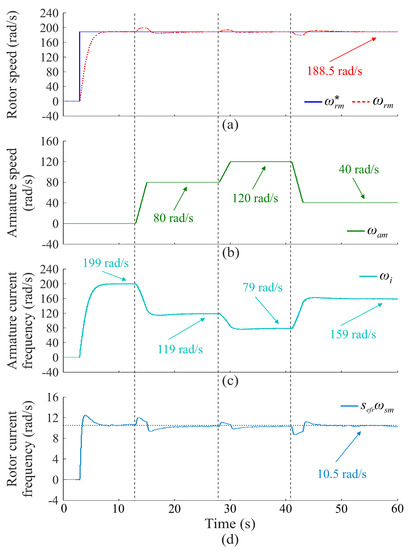 Figure 16 shows the effect of armature speed variation on rotor speed dynamic behavior. In addition, the relationship between armature speed and angular frequency of the armature and rotor currents is also presented. According to Figure 16a, the variations in the mechanical speed of the EFR armature shown in Figure 16b result in small oscillations in rotor speed. However, these oscillations quickly converge to the reference value, so that rotor speed remains constant during system operation. As indicated in Figure 16b,c, a change in the mechanical speed of the EFR armature results in a proportional change in the frequency of the armature currents, so that the absolute angular speed of the armature rotating field given in (1) always remains constant. In this case, the frequency of the rotor currents, which corresponds to the slip speed described in (2), also remains constant during variations in the armature rotating speed, as shown in Figure 16d.