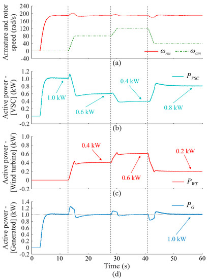 Figure 17 shows power-sharing in the EFR-based system during armature speed variations. According to Figure 17a, in the interval from 3 to 13 s, the EFR rotor operates at a speed equal to rad/s, while the armature shaft is in repose. In this interval, the power supplied by the primary source of the VSC is equal to the generated power of 1 kW (100%), as shown in Figure 17b,d, while the power supplied by the wind turbine is equal to zero (0%) as shown in Figure 17c. In the interval of 13 to 28 s, the armature speed reaches 80 rad/s, which results in the reduction of the power supplied by the VSC to kW (60%) and in increasing the power supplied by the wind turbine to kW (40%), as shown in Figure 17b,c, respectively. When the armature speed reaches 120 rad/s, which occurs in the interval of 28 to 41 s, the power supplied by the VSC and the wind turbine are kW (40%) and kW (60%), respectively. Finally, for s, the armature speed decreases to 40 rad/s, which corresponds to a power supplied by the VSC of kW (80%) and a power supplied by the wind turbine of kW (20%). Based on these results, it is possible to share between the power supplied by the VSC and the wind turbine so that the power generated is always constant, as shown in Figure 17d. Therefore, the EFR-based system allows for implementation of a hybrid generation system with two energy sources providing the resulting power to the power grid or to an isolated load.