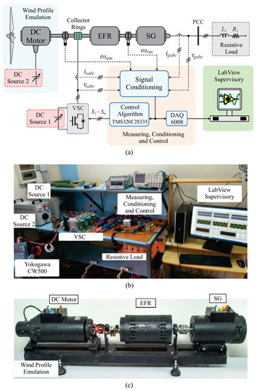 To demonstrate the validity of the proposed performance analysis, experimental results were obtained using a laboratory setup to emulate the EFR-based system, as shown in Figure 18. In the experimental platform, a DC motor was used to emulate wind turbine behavior, as indicated in Figure 18c. Furthermore, the control algorithm was executed using a fast prototyping system DSP-TMS320f28335 with a sampling time of 100 s. The measurement of instantaneous voltage and current values was performed using hall-effect sensors LV20-P and LAH25-NP, respectively.