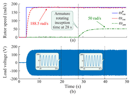Experimental results for performance analysis of the EFR-based system: (a) rotor and armature speed and (b) load voltage.