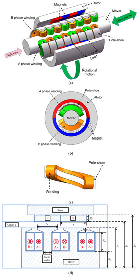 In order to improve the dynamic performance of the MLS and reduce the PM consumption, a novel structure of the EMLS is proposed in this paper; the three-dimensional (3D) and side view of the proposed topology are illustrated in Figure 2a,b, respectively. It can be observed that the proposed EMLS consists of two parts, which are also called the rotor and mover, corresponding to the normal MLS. The helical-type PMs are mounted on the inside surface of the rotor, and two-phase helical-type windings, which are shown in Figure 2c, are mounted in the helical-type slots, which are grooved on the surface of the mover. Thus, the helical-shaped magnetic fields can be generated from the rotor and mover, and they can couple through the airgap. Moreover, the pole-shoes can help to improve the magnetic flux distribution.