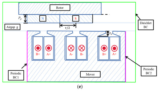 If the same amplitude and opposite current is applied on the A and B phase winding, the thrust force is 0 N when the positions of the pole-shoe and the magnet are completely opposite to each other, as shown in Figure 2d. As the position of the mover moves forward along the axial direction, the relative displacement between the mover and rotor magnetic poles rises and the thrust force increases to a peak until τp/2, as shown in Figure 2e.