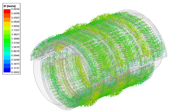 The magnetic field distribution in the proposed EMLS is a 3D helical shape (Figure 3), which means that it requires a 3D FE model to analyze the performance of the magnetic field. The vector magnetic potential A is selected to formulate the magnetic field distribution of the EMLS. The governing equations are