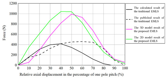 In this paper, a 3D FEA model of the proposed model is developed by using the commercial FEA software Ansys Maxwell. To verify the model and compare it with the traditional EMLS, the specification of the traditional EMLS, which is mentioned in [16] and shown in Table 1, is applied to the proposed 3D FEA model. The 3D vector magnetic field distribution of the proposed EMLS is shown in Figure 3. The corresponding thrust curve is shown in Figure 4. Moreover, to verify the model of the proposed EMLS, a 3D model of the traditional EMLS was also developed. In Figure 4, the thrust force curve of the traditional EMLS is compared with the published one in [16]. From the figure, the calculated result of the traditional EMLS is in line with the published one, and this verifies the effectiveness of the 3D FEA model developed in this paper.
