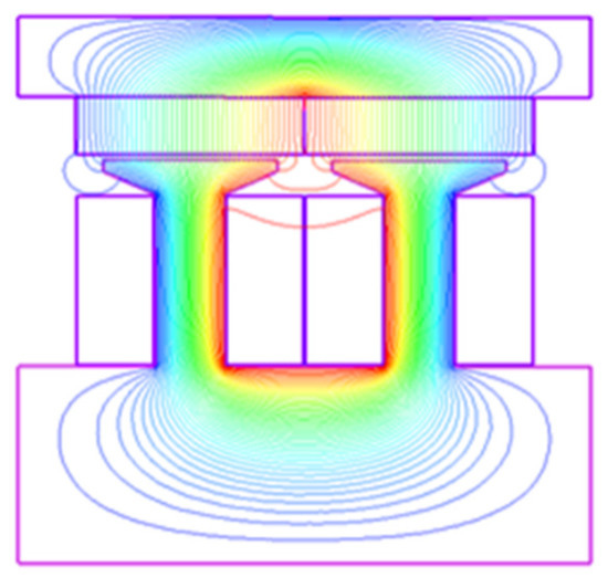However, the process of 3D FEA is time-consuming. If the length of the airgap g is much smaller than the pole pitch τ, the magnetic field distribution can be approximated as 2D axially symmetric [16]. Thus, ignoring the loss of generality, an axially symmetric model, as shown in Figure 2e, which corresponds to the 3D FEA model, can be used for analyzing the performance of the proposed EMLS. In addition, the thrust force of the 2D model is shown and compared with the 3D model in Figure 4. From Figure 4, the thrust force of the 2D and 3D models shows good agreement, and the error of the maximum thrust force is 4.2%. Hence, the 2D axis-symmetrical model is proven to be a reasonable alternative to the 3D model for force prediction. Moreover, the magnetic flux distribution of the 2D model is given in Figure 5.