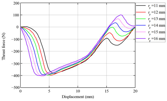 The thrust force variation with the pole-shoe width τp is shown in Figure 6. It may be observed form Figure 6 that τp slightly influences the maximum thrust force. However, it changes the rise rate of the curves. Wider pole-shoes provide a faster rise in the thrust force, which means that the EMLS can enter working mode with less displacement. For example, suppose that the WEC requires 300 N as the minimum drive force to keep the generation device in working condition; a 16 mm width pole-shoe of the proposed EMLS with only approximately 2 mm of moving displacement can help the WEC to cope with frequently changing sea conditions. Under the premise of ensuring the installation space of wires, increasing τp as much as possible within lead can increase the timeliness of the WEC response.