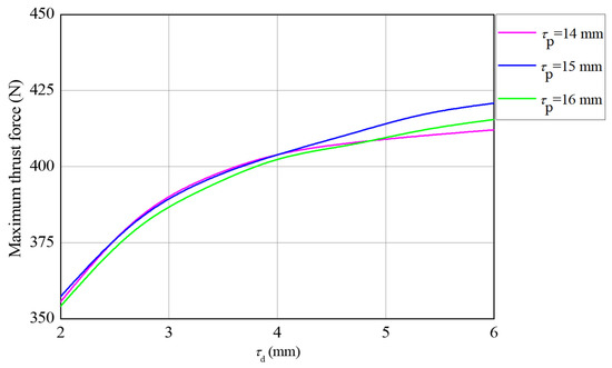 At the same time, Figure 7 shows the variation in the maximum thrust force with the thickness of the pole-shoe τd. From the figure, the τd enhances the thrust force in a rate of decay. However, the τd has no effect on the shape of the thrust force waveform. Therefore, with a reasonable choice of τd and τd, one can help the EMLS to increase its drive force without slowing down the EMLS’ startup.