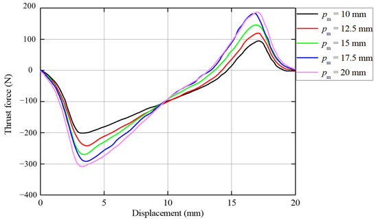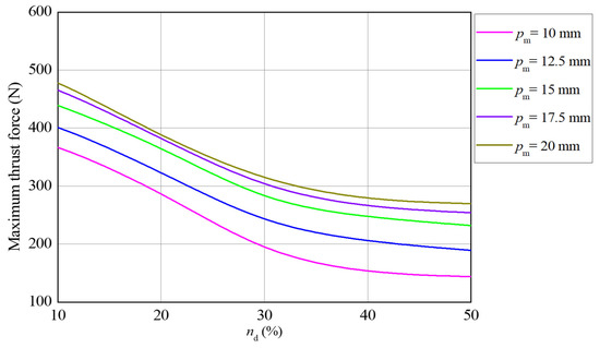 The effect of pm and nd is illustrated in Figure 8 and Figure 9; it seems to be simpler because these two variables only affect the maximum value while keeping the waveform. The effect of pm on the force is gradually diminishing due to the saturation, as shown in Figure 10. When pm rises to 17.5 mm, there is almost no increase in thrust force compared to the last comparative level. Moreover, the influence of nd on the maximum thrust force is weak first, and then strong, and finally weakened again. However, an excessive increase in nd will lead to a decrease in the energy density of the EMLS. Therefore, choosing an appropriate pm and nd according to the required torque of the generator will help the EMLS to achieve the best energy utilization efficiency.