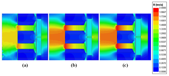 The 2D magnetic flux distribution of the proposed EMLS. (a) = 15 mm; (b) = 17.5 mm; (c) = 20 mm.