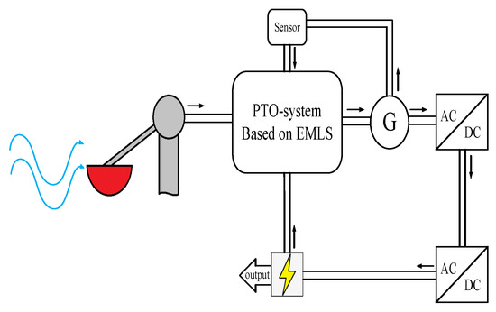 With the exception of the quick start, the main feature of the proposed EMLS is the adjustable parameters. Unlike a pure MLS with a permanent magnet, the EMLS can change the strength of the magnetic field by changing the current through it; thus, the thrust force can be changed too [7]. According to the overview of energy conversion shown in Figure 12, the PTO system with the proposed EMLS can receive a signal from the sensor, which collects current information from the generator. The AC source stores some electricity to ensure that the EMLS has enough power to provide the minimum force capable of actuating the PTO. When the wave comes to push the PTO, the EMLS starts to operate and the AC signal of generation rises from 0. The AC source will provide an increasing current at the same frequency as the generator’s signal. The increasing current must be limited to a predefined maximum value to ensure that the EMLS is always able to provide suitable thrust, instead of being affected by overlarge torque. Thus, the EMLS will be quick and easy to start, and it will have a satisfactory thrust force during operation at the same time. The electricity from the generator will be converted into DC for transmission, and then converted to qualified AC collected by the AC source. Then, the accumulated energy will be divided into two parts; a small fraction is used to provide the power needed by the EMLS, and the rest will be exported to the grid.