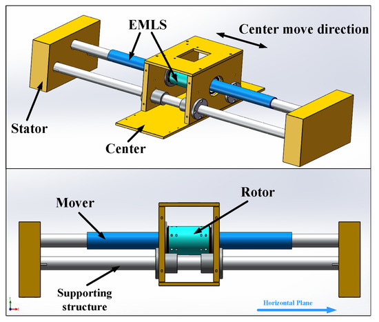 Because of its dynamic performance, the PTO of the point absorber with the proposed EMLS can be improved as shown in Figure 13. Two stators are fixed inside the float, and support structures are connected between them to hold up the center. The rotor is mounted inside the center, and the mover is fixed between two stators to remain completely still. Different from a normal WEC device, which is powered directly by waves, the device relies on gravitational potential energy from the buoy as it is pushed by waves. The central part will slide back and forth linearly with the float. Then, the linear motion can be transferred to rotational motion by the proposed EMLS. With the very small initial magnetic resistance, the variable magnetic resistance enables the device to start working at a small incline angle and to have sufficient torque and thrust when it reaches the normal working state. The device can also ignore high and low tides, which render normal PTO devices difficult to operate due to their structure, which moves with the sea level. In addition, this proposed EMLS also can be introduced in floating wind turbine energy conversion, as mentioned in [17,18].
