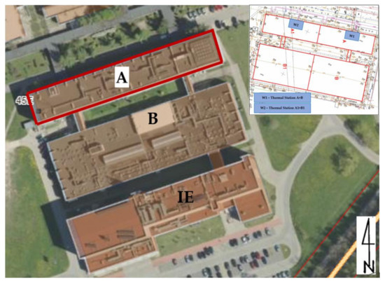 View of the location of the tested building (part A) with the layout of the W1 and W2 thermal substations in the state before modernization [42].