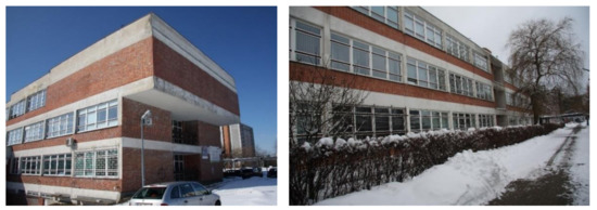 The analyzed building, shown in Figure 2, was constructed in the system of a reinforced concrete framed structure. The longitudinal external walls are made of aerated concrete 36 cm thick, ceramic brick 6.5 cm thick and ceramic façade tiles (from the outside). The external gable walls are made of 36 cm thick aerated concrete and ceramic façade tiles (from the outside). The external walls of the basement, 30 cm thick, are made of concrete and additionally (longitudinal walls) made of 12 cm thick perforated bricks. The ceilings in the building are made of hollow-core slabs and reinforced concrete slabs. The roofs are flat, covered with tar paper and insulated with mineral wool and is 4 cm thick above the auditorium, while 8 cm thick in the other rooms [43]. In part A of the building, the entire window and door joinery was replaced before 2011. New windows, which are made of PVC, are not equipped with air inlets. Fresh air is supplied into the building through the gaps obtained by thinning the rubber gaskets on the fragments of rebates of the window sashes to the frames. There were skylights above the auditorium and staircases.