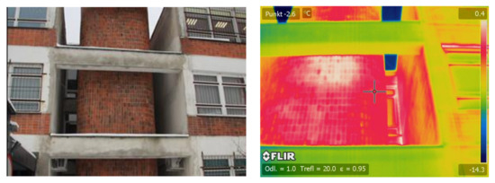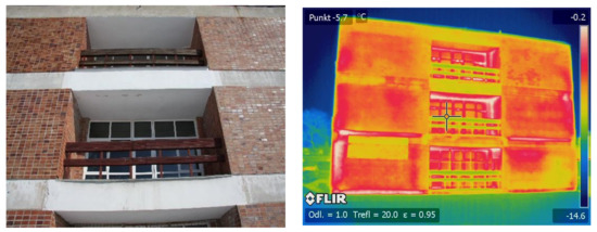 Modernization measures were selected based on an analysis of the existing condition and archival documentation as well as after a thermovision inspection of all external partitions of the building. Selected thermal images showing the thermal condition of the building envelope before thermomodernization are shown in Figure 3 and Figure 4.