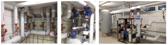 Figure 6 shows the view of the W1 heat substation with an average operational production efficiency of 0.89 before modernization, while Figure 7 shows the modernized heat substation, working only for heating purposes of the building in part A, with an average operational efficiency of 0.95 [43,48].