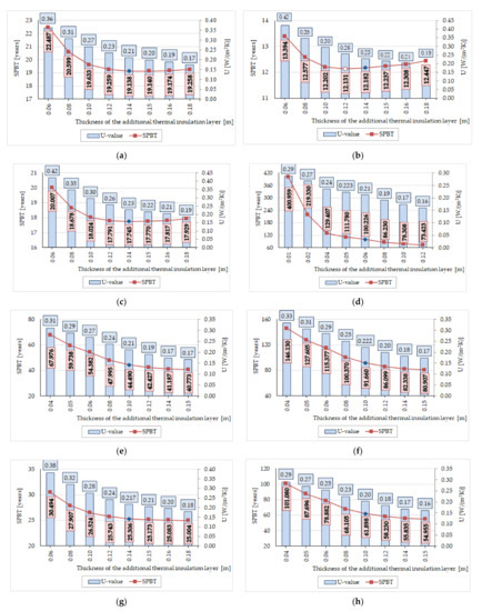 For each external partition of the building, the cost-optimal variant was selected in the energy audit [43], according to the methodology in force in Poland [12]. For all partitions, the optimal thickness was determined, at which the simple payback time SPBT [years], determined according to the Formula (1), assumes the minimum value.