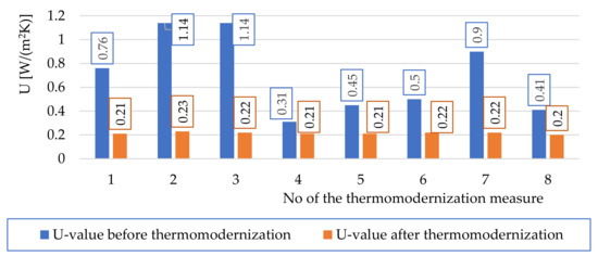 The results of the research on the investments implemented in Poland [29] indicate that in the conditions of a temperate continental climate, in the north-eastern part of the country, as a result of the deep thermomodernization of utility buildings located in rural areas, final energy savings of 46–65% and a reduction in CO2 emissions by 45–86% were achieved. In the case of small churches located in the same region of Poland, the energy effects were at the level of 32–66% [30]. Research on buildings from other regions of Poland has shown similar possibilities of reducing energy demands by up to 64% [31,32]. Blazy et al. [33] also analyzed the potential ecological effects.