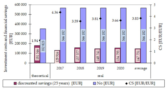 None of the -values presented in Figure 15 met the economic efficiency condition of 0 < < 1. The value determined for investment outlays and savings based on the performed energy audit, i.e., at the planning stage of the thermomodernization investment, was 1.94 EUR/EUR and exceeded the upper value of the economic efficiency condition by 94%. The value of the index with real costs and savings was much higher and amounted to 3.59–4.26 EUR/EUR (the average value from the 4 years analyzed was 3.83 EUR/EUR). This clearly shows that for such investments, which are necessary for the energy policy and environmental reasons, to be undertaken by the investor, they should receive financial support.