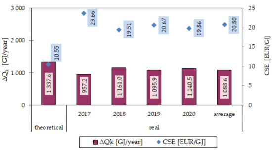 The obtained ecological effects determined in accordance with Formula (13), both with the theoretical method and based on actual measurements of heat consumption in the building in 2017–2020, are presented in Table 13.
