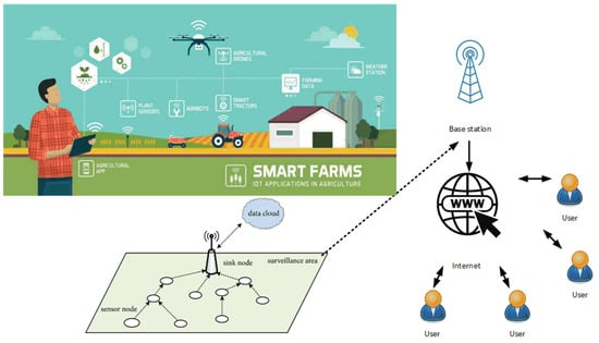 Figure 1 shows the scenario for a smart agriculture orchard based on various sensors, sink notes, base station (BS), Internet, and PH, temperature, fertilizer, water, heat, and humidity. Nevertheless, a smart agriculture orchard that would rely on seasonal climate in the field has been impacted by climate change with heavy rain, droughts, floods, and unexpected weather conditions that have affected the agricultural ecosystem [1,4,5]. Currently, the WSN has been applied worldwide because of the low cost, easy deployment, and cost-effective environment [1,6,7].
