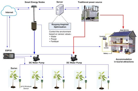 As shown in Figure 6, the power levels from each smart energy node were measured with a voltage sensor and fed to the ESP32 microcontroller board within each smart energy node in the system. It was then transmitted from each smart energy node to the server at the center of the system via the HTTP protocol. At the host computer of the system equipped with the KIO algorithm, the energy generated from each smart energy node was inputted into the optimization equation to decide whether to supply electricity from the smart energy nodes from the conventional energy source to the durian plantation and homestays.