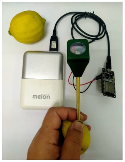 As shown in Figure 9, the interior of the smart energy node was connected to a special set of sensors buried in the soil beneath the durian trees that the researchers had developed specifically to enable accurate and robust measurements. This was more weather resistant than prefabricated sensors available today. After connecting the special sensor to the ESP32 board, the researchers tested the pH values of a lemon (Figure 10).