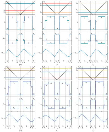 The SHV ripple is defined as in (5). As stated in Section 2.2, the average value of idcSHC over one switching period is zero whatever modulation strategy is used. It means that the initial and final values of the SHV in dc-link are the same. Therefore, the dc-link SHV pattern is the same for each switching period. On the other hand, the dc-link voltage period is π/3 with balanced and sinusoidal output ac current as shown in Figure 2a. Therefore, only one sector of a range of π/3 needs to be analyzed in this case. However, from Figure 2b–d, it is clear that the envelopes of dc-link SHV are quite different with different harmonic combinations in ac currents. Therefore, to consider all possible harmonic combinations in ac currents, the dc-link SHV analysis range should be extended to 2π. Figure 3 depicts the dc-link SHV over one switching period with whole sectors.