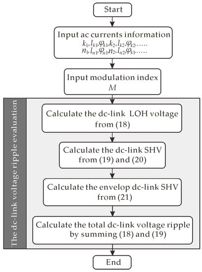With given LOHs in output ac current, the dc-link LOH voltages and SHVs can be directly calculated by the Equations (18)–(20), respectively, and the envelope of SHVs is determined by (21). Then the theoretical total dc-link voltage ripple can be obtained by summing the results of (18) and (19). Figure 4 gives the flow chart of the dc-link voltage ripple for the VSC with nonlinear output current.