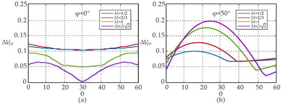 Normalized peak-to-peak dc-link voltage ripple amplitude ΔVpp over the period [0, 60°] for different modulation indices, M = 1/2, 2/3, 1, and 2/, and output phase angles (a) φ = 0° and (b) φ = 50°.