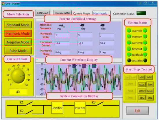 The experimental setup is shown in Figure 7. It should be pointed out that the power module in the experimental setup is mounted on a heatsink and covered by a drive board, so it can not be seen in Figure 7. The graphic user interface shown in Figure 8 is used to control the grid-tied inverter output current. The PI paralleled with multiple PR controllers in a d-q reference frame were used to inject the desired multiple LOH currents into the grid. Therefore, the dc-link voltage ripple can be easily evaluated under a specific ac current. The switching and sample frequency are 10kHz, and all the experimental parameters are consistent with the simulation.