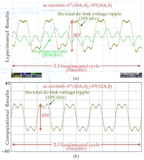 Experimental and computational results of the dc-link voltage ripple when the ac currents contain −1st (10A, 0) and −5th (10A, 0): (a) experimental results; (b) computational results.