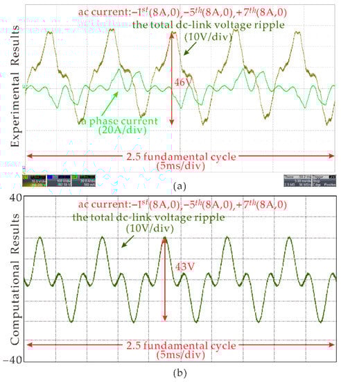 Experimental and computational results of the dc-link voltage ripple when the ac currents contain −1st (8A, 0), −5th (8A, π), and +7th (8A,0): (a) experimental results; (b) computational results.