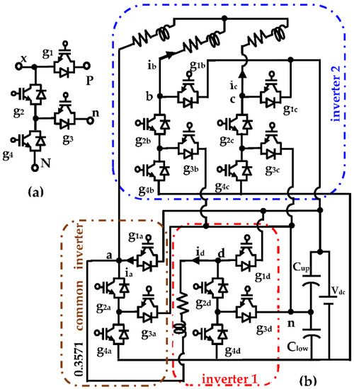 Similar dual-phase inverter configurations using the three-level diode-clamped and T-type inverter legs are shown in Figure 2. The operational principles (switching sequences) of these inverter legs were still conserved. Functionally, the same control/modulation approach could be deployed in all the inverter configurations shown in Figure 1 and Figure 2. However, the topological features, including the cost and loss performances of these inverter legs, differed significantly, as explicitly demonstrated in [23].