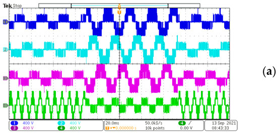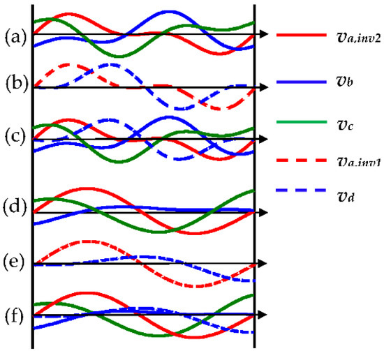 In the derived sets of reference waveforms, is equal to . With reference to the neutral point, n, this implied that in inverter 1 is equal to in inverter 2. In addition, the corresponding output voltage of inverter 1, vad, is given in (5) and the output line voltages (vab, vbc, vca) in inverter 2 are given in (6a–c):