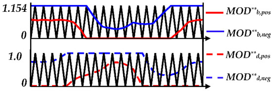 Each inverter leg had two modulating waveforms that were used to generate the positive and negative half-cycles of the inverter-leg output voltage. These waveforms, given in (17a,b), were obtained by subtracting the max and min values in (14) and (15) from the inverter-leg reference voltage waveforms derived in (3a,b) and (4a–c). Subscript x in (17a,b) connotes the phase notations (a,inv2, b, c); and pos, neg denotes the positive and negative half-cycles.