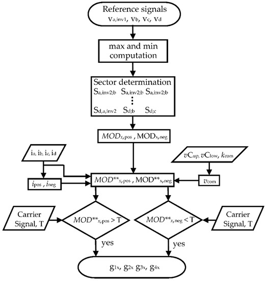 A flowchart that shows all the necessary steps for generating the gating signals of the inverter power switches is given in Figure 6.