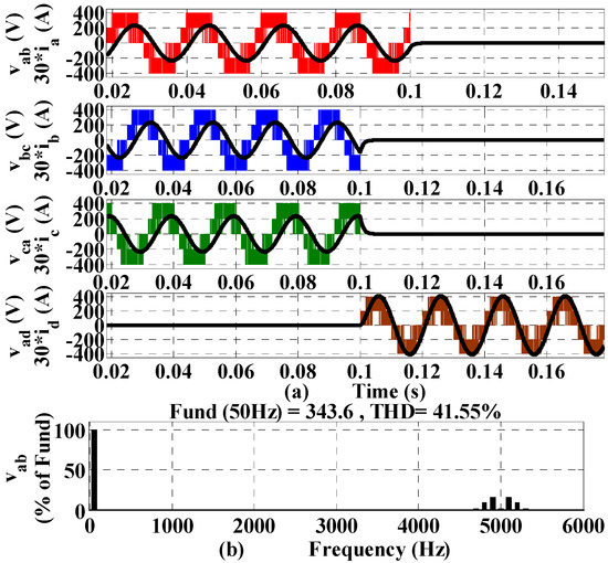 As noted in Section 1, the proposed inverter offered an additional advantage of providing an optional possibility of isolating either of the constituting inverters if the need for this operating condition arose. However, the common inverter leg was required to be in place in order to explore this operation. Figure 8a shows the output voltage and current waveforms for either operation of inverters 1 and 2. The result of the FFT analysis of the line voltage, vab, of inverter 2 is displayed in Figure 8b.