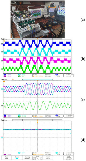 Prototype setup, experimental output voltage and current waveforms of the dual-phase inverter for common and different frequency operations, and capacitor-bank voltages. (a) Inverter prototype setup; (b,c) output voltages and current waveforms for common-frequency (50 Hz) operation and different modulation indices of 1.1547 and 1, and for the common modulation index (0.7559) and different 50 and 100 Hz frequency operations for inverters 1 and 2; (d) corresponding capacitor banks’ voltage waveforms.