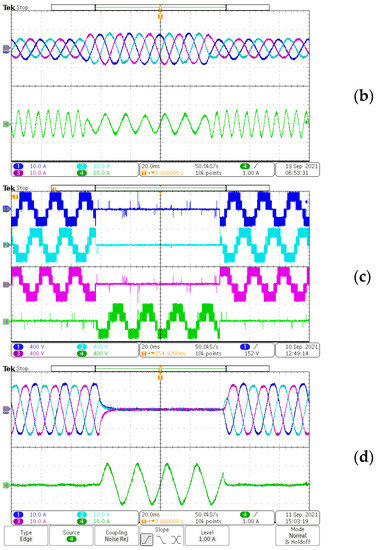 Experimental output voltage and current waveforms of the dual-phase inverter for different frequencies and modulation indices. (a,b) Output voltage and current waveforms for frequencies and modulation indices for inverters 1 and 2 of: 50 and 150 Hz, with modulation indices of 0.35 and 0.8 (50 Hz), and 50 and 75 Hz, with modulation indices of 1.05 and 0.25; (c,d) either operation of the two inverters at a common frequency of 50 Hz and modulation indices of 1.1547 and 1.