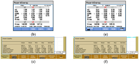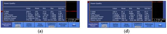 An experimental demonstration of the possibility of isolating either of the two inverters is shown in Figure 10c,d. Therein, an output frequency of 50 Hz at point mp was used. For the same peak-point operation the inverter input power was experimentally measured with the power analysis application module MDO3PWR using an MDO3034 oscilloscope. The same module was used to measure the power delivered to the one-phase load; while a Fluke 434/435 three-phase power-quality analyzer was used to measure the power delivered to the three-phase loads. The results of these power measurements are displayed in Figure 11a–c, and depict an inverter efficiency of 98.6647%. Furthermore, load variation in the dual-phase system was demonstrated with a 40 Ω resistor in series with a 20 mH inductor in each phase of the three-phase system; and a 20 Ω resistor in series with a 20 mH inductor in the single-phase system. The appropriate power measurements were taken, and these are displayed in Figure 11d–f; an inverter efficiency of 98.6856% was calculated.