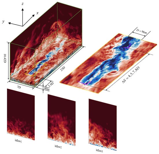After analyzing the statistics of time-averaged wakes, in this section we focus on the features of the instantaneous wakes. In Figure 13, we examine the standard deviation of the instantaneous wake center positions in the spanwise direction. The instantaneous wake center was identified using the Gaussian fitting method, as in our previous work [43]. First, it is seen that the standard deviations of the instantaneous wake center positions (i.e., ) varied linearly with the downwind distance from the turbine. The growth rates of the waked turbine were approximately the same as that of the corresponding stand-alone wind turbine. With the increase of the ambient turbulence intensity, the growth rate of increased from 0.24 for inflow1, to 0.32 for inflow2 and 0.42 for inflow3. For the waked wind turbine, an overall shift of was observed, which is in the order of , and is approximately the same for different downwind spacings and different inflows. In the far wake, continued to increase in a linear manner, which indicates the passive scalar nature of the wake meandering for the considered cases.