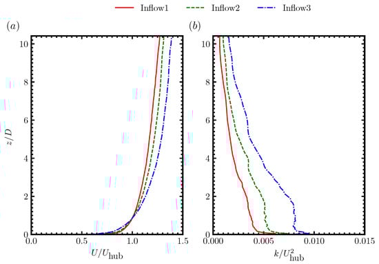 To better show how turbulence kinetic energy k and velocity deficit vary in the streamwise direction, we show the disk-averaged k and via x in Figure 9. The circular disk employed for averaging has its center located along the axis of the rotor and its radius the same as the rotor radius R. We first examined the streamwise variations of the velocity deficit. It was seen that the overall variations of were similar for different cases, that first increased in the near wake and then gradually decreased as one travels to further turbine downwind locations. For the stand-alone turbine case, the maximum velocity deficit, with its locations moving closer to the turbine (from to turbine downwind when the inflow is changed from inflow1 to inflow2), was reduced with the increase of the ambient turbulence intensity. In comparison of the wake of the waked turbine and the stand-alone turbine, it was seen that the oncoming wake increased the magnitude of the maximum velocity deficit, and slightly moved the corresponding location closer to the turbine. For the waked wind turbine, one interesting observation was that the location for the maximum velocity deficit was closer to each other for different inflows for the same turbine spacing, which indicates that the oncoming wake has a dominant impact on the location of the maximum compared with the ambient turbulence. Another observation is that the wake of the waked turbine recovered faster than that of the stand-alone turbine, for which we can expect. For different downwind spacings, the wake of the waked turbine of the cases with recovered faster than those of the cases with . The differences on wake recovery became less significant with the increase of the ambient turbulence intensity. We then compared the streamwise variations of the disk-averaged turbulence kinetic energy k for different cases. It was seen that the overall trends of k were similar for different cases, which increased in the near wake and decreased at further turbine downwind locations. For the stand-alone wind turbine under different inflows, it was seen that the magnitude of the peak of the turbulence kinetic energy increased with the increase of the ambient turbulence intensity with the location of the peak moving closer to the turbine from turbine downwind for inflow1 to turbine downwind for inflow3. For the turbine in the wake of an upwind turbine, it was seen that the oncoming wake induced a higher magnitude of the maximum turbulence kinetic energy k, and earlier appearance of the peak of k. The magnitude of the peak of k gradually decreased with the increase of turbine spacing for the waked wind turbine, which is related with the decrease of the k of the oncoming wake turbulence. The location for the peak of k was observed closer to the turbine for smaller downwind spacings and ground with higher surface roughness lengths. As for the development of k after the peak, the decay rates were higher for the waked wind turbine when compared with the stand-alone wind turbine for inflow1 and inflow2. For inflow3, on the other hand, the decay rates for the waked wind turbine and the stand-alone wind turbine were simiar with each other. The most important observation in Figure 9 is that the differences of k and between the wake of the waked wind turbine and the stand-alone wind turbine existed mainly in the near wake. In the far wake, k and from cases with different turbine spacings were similar with each other and closer to that of the stand-alone wind turbine for the same inflow. One note is that the comparison made in Figure 9 depends on the radius chosen for averaging, that the turbulence kinetic energy from the waked wind turbine was slightly higher than that from the stand-alone wind turbine in the far wake region by choosing a relatively larger disk, as the values of k were higher near the wake boundary for the waked turbine (Figure 8).