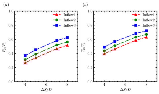 The power and thrust of the waked turbine, which were normalized using that of the first turbine, are shown in Figure 3. As expected, the normalized power () and thrust () increased with downwind turbine spacing and the increase of the inflow turbulence intensity, as the former one increased the downwind distance for wake recovery and the latter one increased the rate of wake recovery.