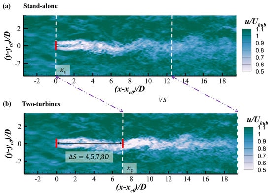 Contours of instantaneous streamwise velocity on the horizontal plane located at turbine hub height for (a) the stand-alone turbine case and (b) the two-turbine case with for inflow1 with m.