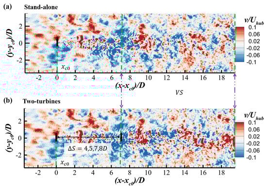 Contours of instantaneous spanwise velocity on the horizontal plane located at turbine hub height for (a) the stand-alone turbine case and (b) the two-turbine case with for inflow1 with m.