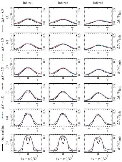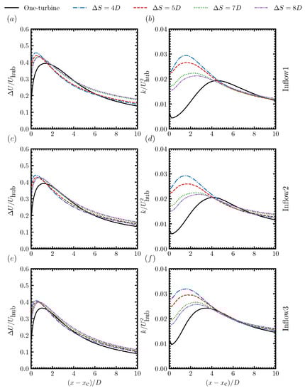 In Figure 6, we compare the spanwise profiles of the streamwise velocity deficits () downwind of the second turbine of the two-turbine cases with those downwind of the stand-alone turbine. In the near wake, the velocity deficit profiles of the second turbine from the two-turbine cases with were close to the Gaussian distribution at the turbine downwind. In contrast, the velocity deficit profiles for the stand-alone turbine case and the two-turbine cases with were close to the double-Gaussian distribution with a low velocity deficit region near the hub. At further turbine downwind locations, the differences between the wake of the waked turbine and the stand-alone turbine became less significant. The major difference observed was that the wake of the waked turbine was broader than the stand-alone turbine. Effects of inflow conditions on the distribution of the streamwise velocity deficit were observed; the velocity deficit was smaller and was distributed in a wider wake region as a result of the enhanced mixing due to the increased ambient turbulence.